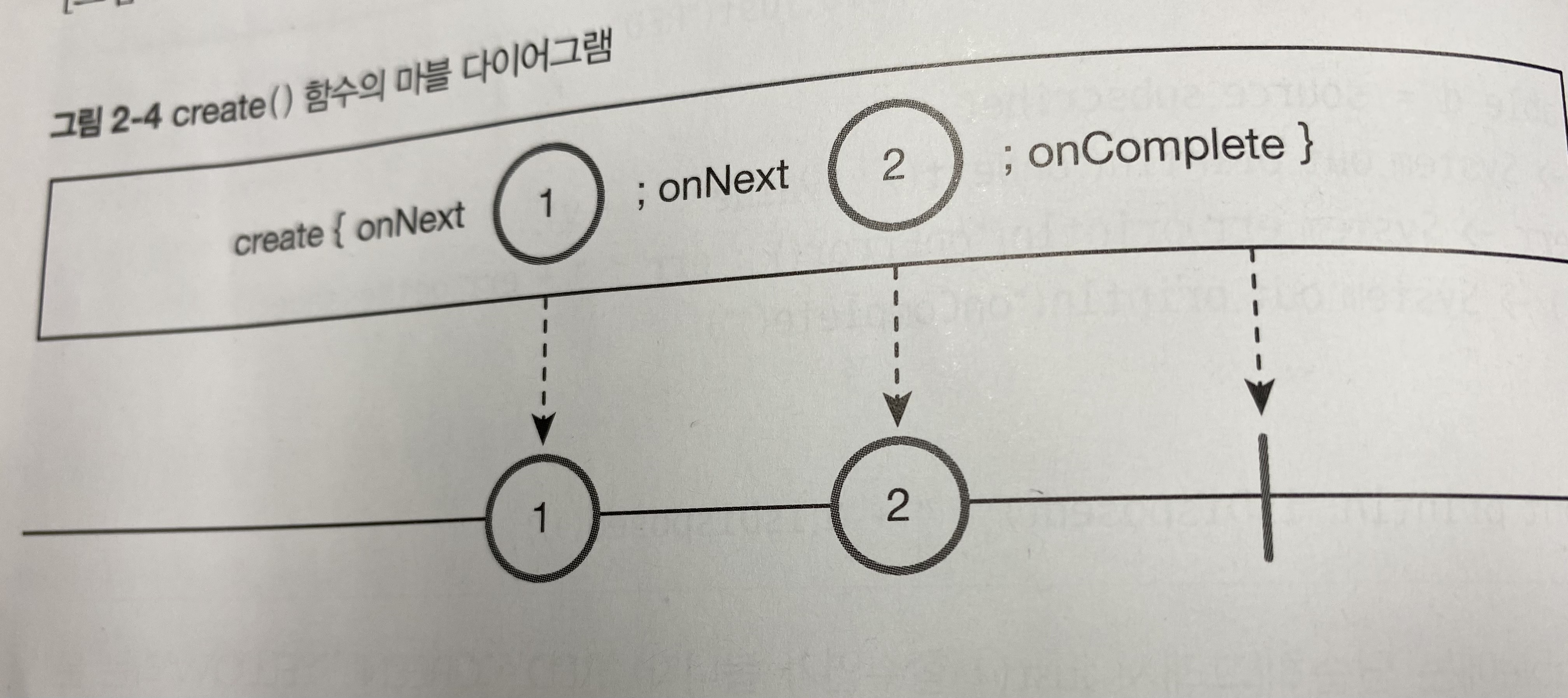just() 함수는 데이터를 인자로 넣으면 자동으로 알림 이벤트가 발생하지만 create() 함수는 onNext , onComplete, onError 같은 알림을 개발자가 직접 호출해야 합니다. 그래서 create() 는 라이브러리가 무언가를 해준다기보다 개발자가 무언가를 직접 하는 느낌이 강한 함수 입니다