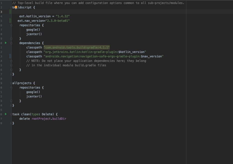 build.gradle(project) 는 최상위 gradle 파일로 써 각 모듈에서 사용 할 플러그인 을 지정 하는 곳(플러그인 뿐만 아니라 기타 하위 모듈에서도 사용 되는 것을 세팅)