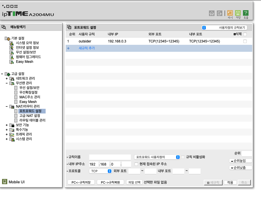 여기서 포트포워드 설정을 눌러서 내부IP 와 외부 포트 내부 포트 를 자신이 원하는 포트 넘버로 설정해줍니다!