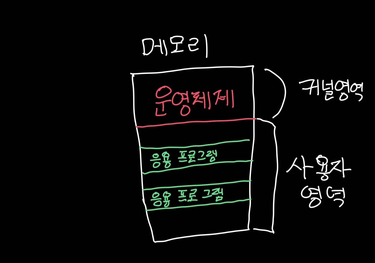 운영체제는 매우 특별한 프로그램이라서 메모리영역에서 커널영역이라는 곳에 적재되어 실행됩니다