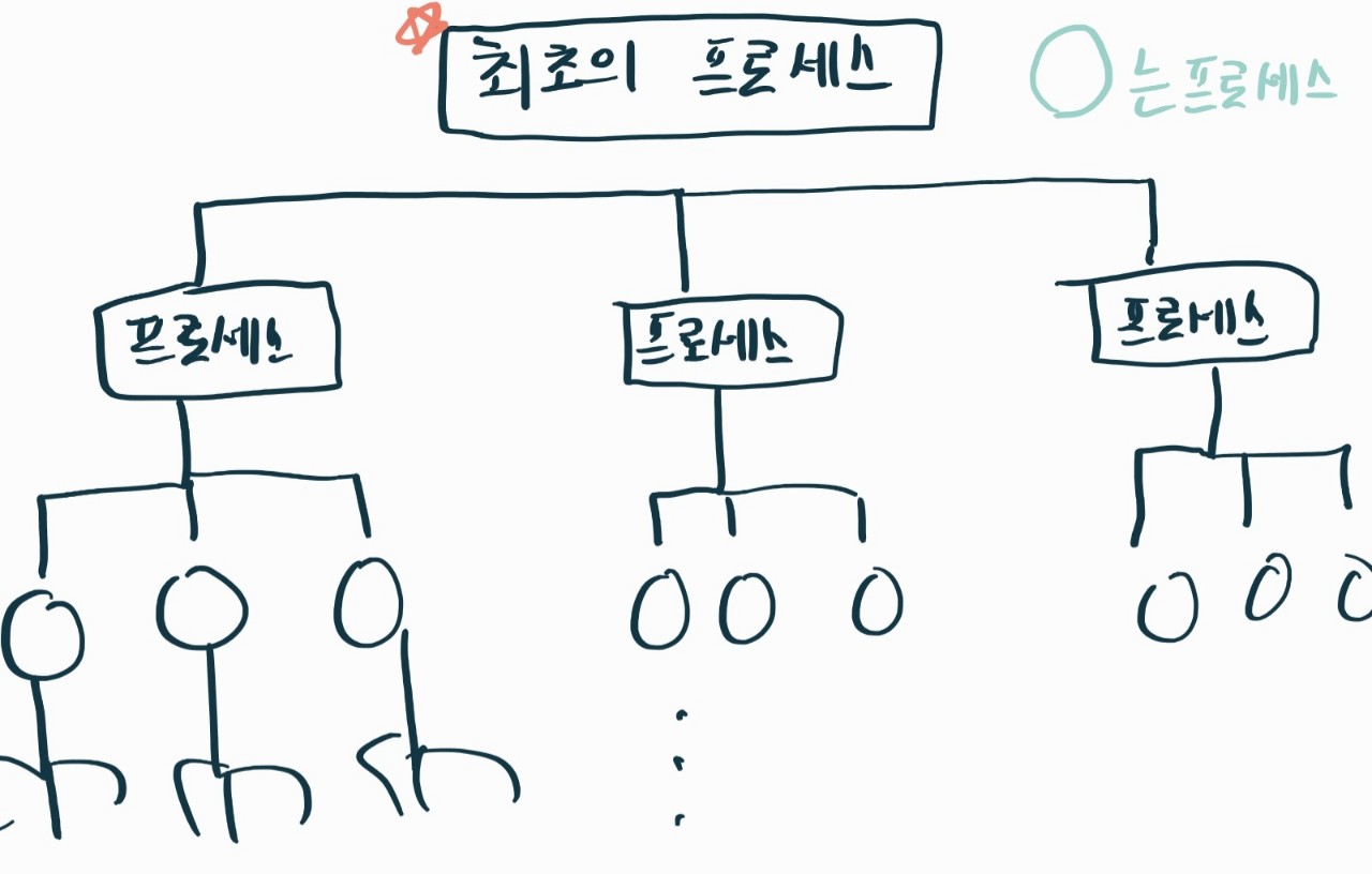 최초의 프로세스 하나가 있으면 그 최초의 프로세스로 부터 자식 프로세스를 낳으면서 우리가 컴퓨터를 통해서 프로그램을 사용하고 있는것입니다!