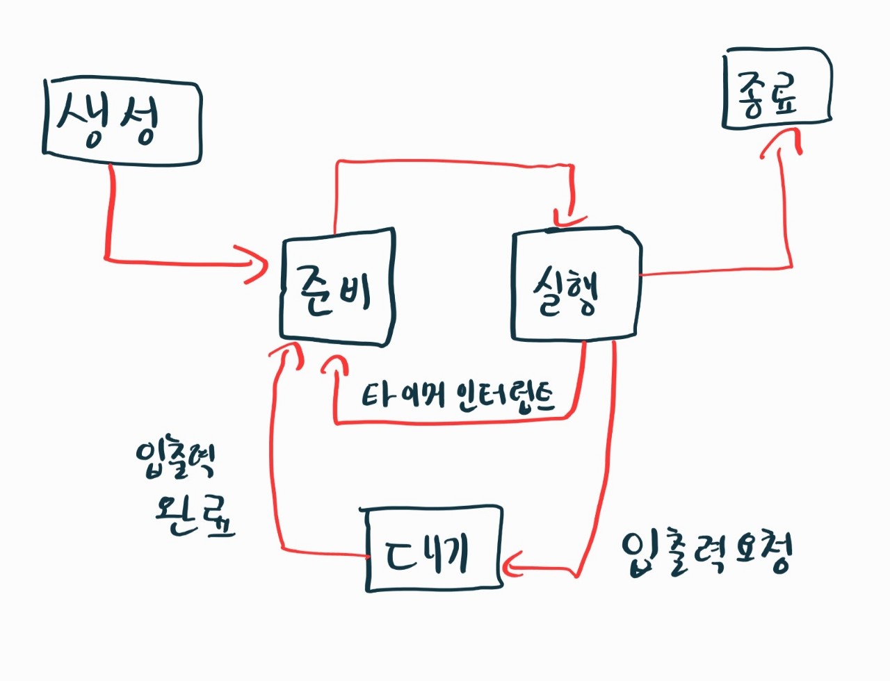 이때 프로세스가 할당된 시간을 모두 사용하면 타이머 인터럽트(timer interupt)가 발생하여 다시 준비상태로 돌아가서 자신의 차례를 기다립니다 그리고 실행 도중 입출력장치를 사용해야 할때 (예를 들면 하드디스크에 데이터 저장 등) 대기 상태로 들어가서 입출력 요청이 완료될때 까지 대기상태가 됩니다
