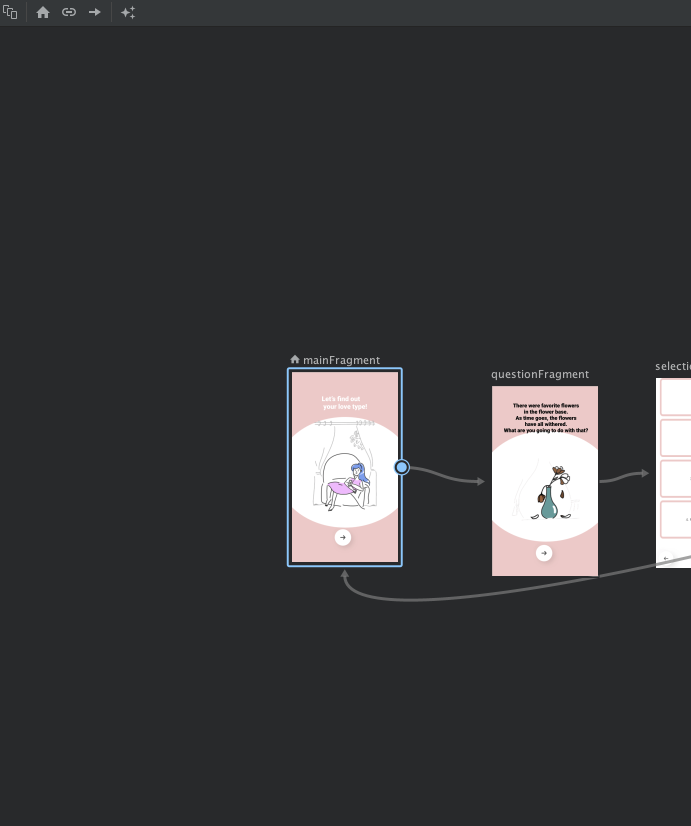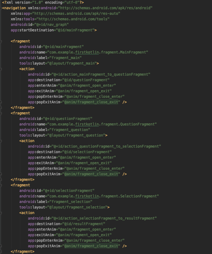 nav_graph에 프래그먼트를 연결 시켜놓으면 이미지 처럼 action_mainFragment_to_questionFragment 라는 id가 생깁니다