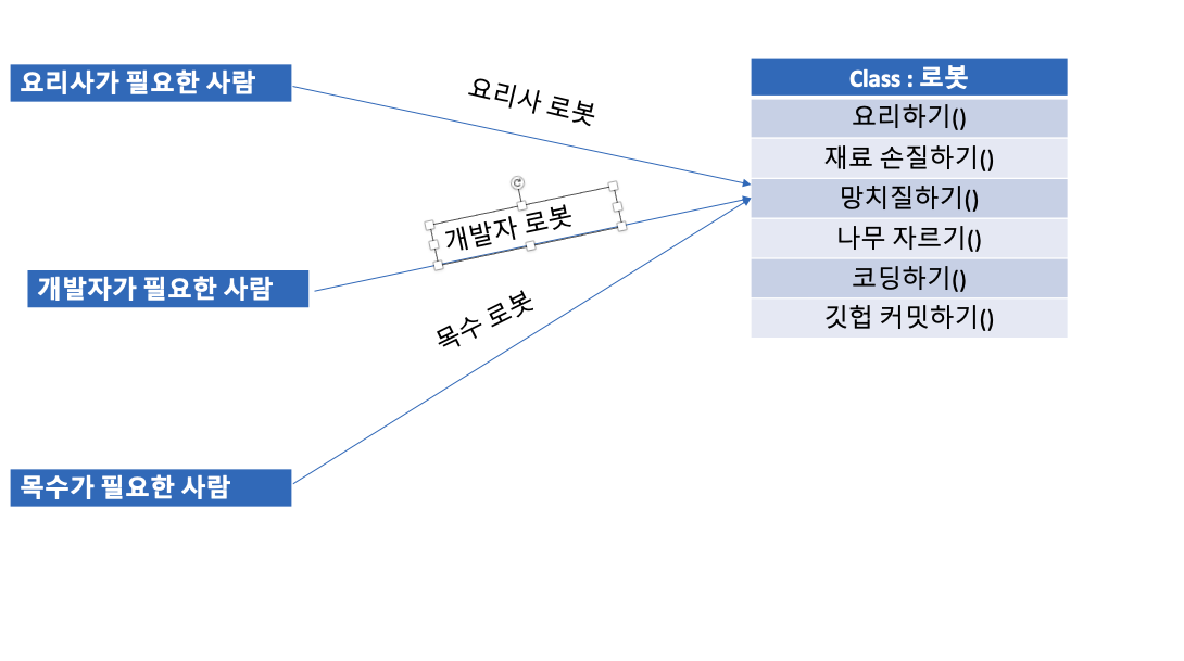 이때 각각의 로봇의 기능을 하나의 로봇 class에 구현하게 되면 아래의 이미지 처럼 됩니다