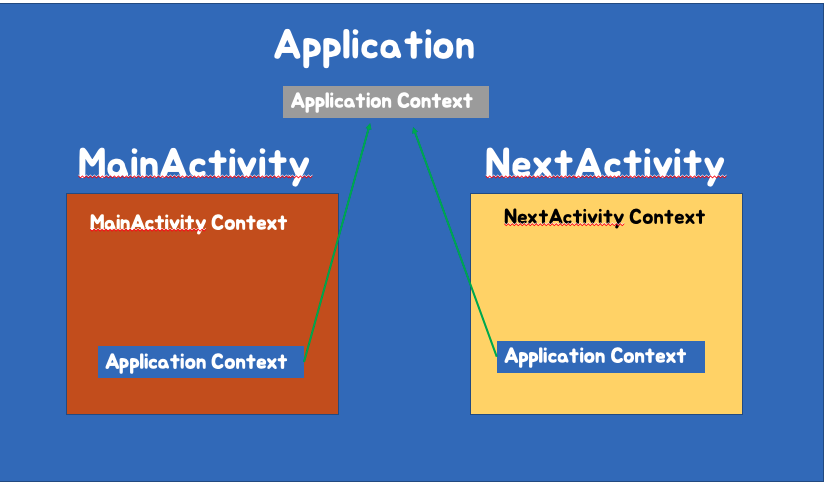 Application Context 는 싱글턴 인스턴스이며 액티비티에서 getApplicationContext()를 통해 접근할 수 있습니다. 이 컨텍스트는 애플리케이션의 라이프사이클과 연결되어 있습니다. Application Context는 현재의 context 와 분리된 라이프사이클을 가진 context가 필요할 때나 액티비티의 범위를 넘어서 context를 전달할 떄에 사용합니다.