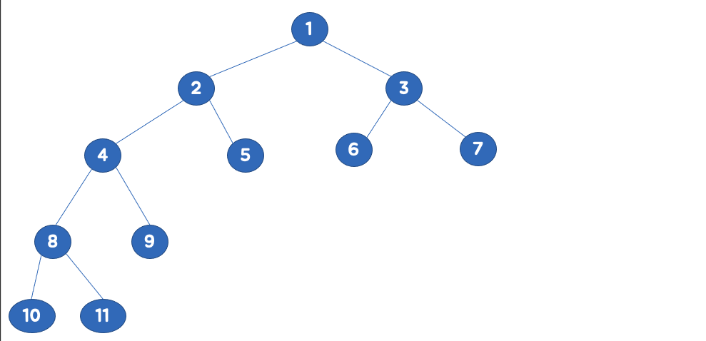 왼쪽에서부터 채워져 있는 이진 트리를 의미합니다. 마지막 레벨을 제외하고는 모든 레벨이 완전히 채워져 있으며. , 마지막 레벨의 경우 왼쪽부터 채워져있습니다
