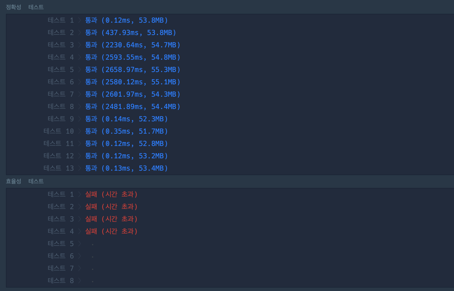 이런 처참한 결과를 얻게되었습니다 ㅠㅠ 테스트3부터 8번까지 말도안되는 실행시간.....