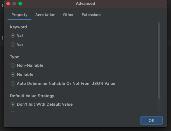 Advanced 를 누르면 Model 의 각종 옵션 , 속성을 지정할 수 있습니다! 예를들면 val 또는 var 아니면 Nullable 또는 Non-Nullable